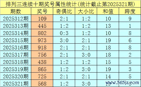 上期回来:陈列三第2025321期奖号:568。类型:组六,奇偶花式:奇偶偶,大小花式:大大大,和值:19,跨度:3。